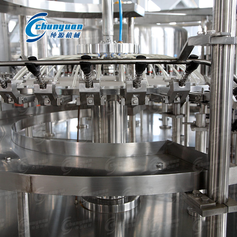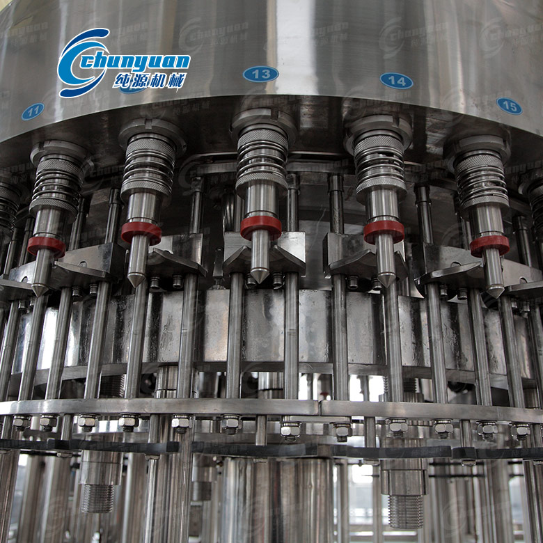 全自動飲用水灌裝機械采用卡瓶頸傳動技術,實現全自動沖瓶、灌裝、旋蓋等工序,自動化程度高。