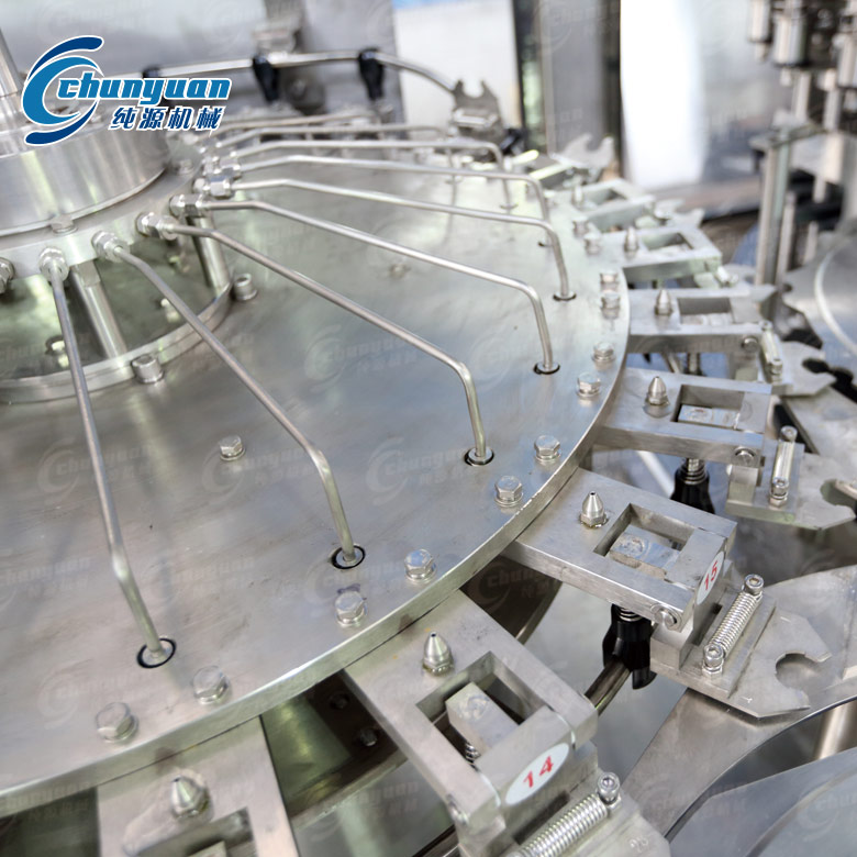 純源機械廠家供應的全自動茶飲料灌裝機械采用卡瓶頸傳動技術,實現全自動沖瓶、灌裝、旋蓋等工序,自動化程度高;配有完善的溫度控制系統和回流系統,設有完善的自動清洗系統及控制程序,整個飲料機械與液體接觸的零件全部使用優質不銹鋼材料及食品級橡膠。