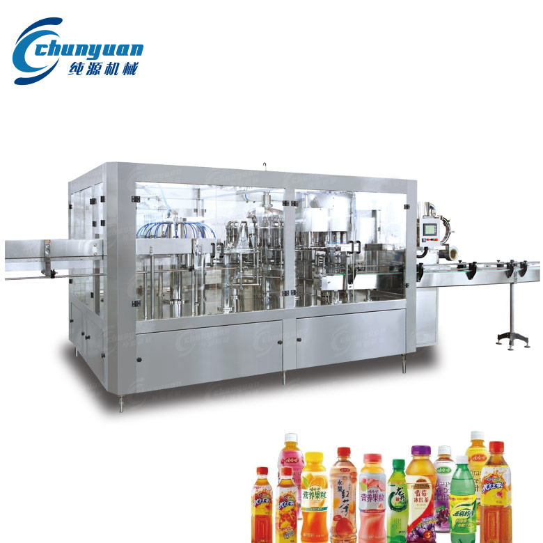 純源機械廠家供應的全自動冰紅茶飲料灌裝機械采用卡瓶頸傳動技術,實現全自動沖瓶、灌裝、旋蓋等工序,自動化程度高;配有完善的溫度控制系統和回流系統,設有完善的自動清洗系統及控制程序,整個飲料機械與液體接觸的零件全部使用優質不銹鋼材料及食品級橡膠。