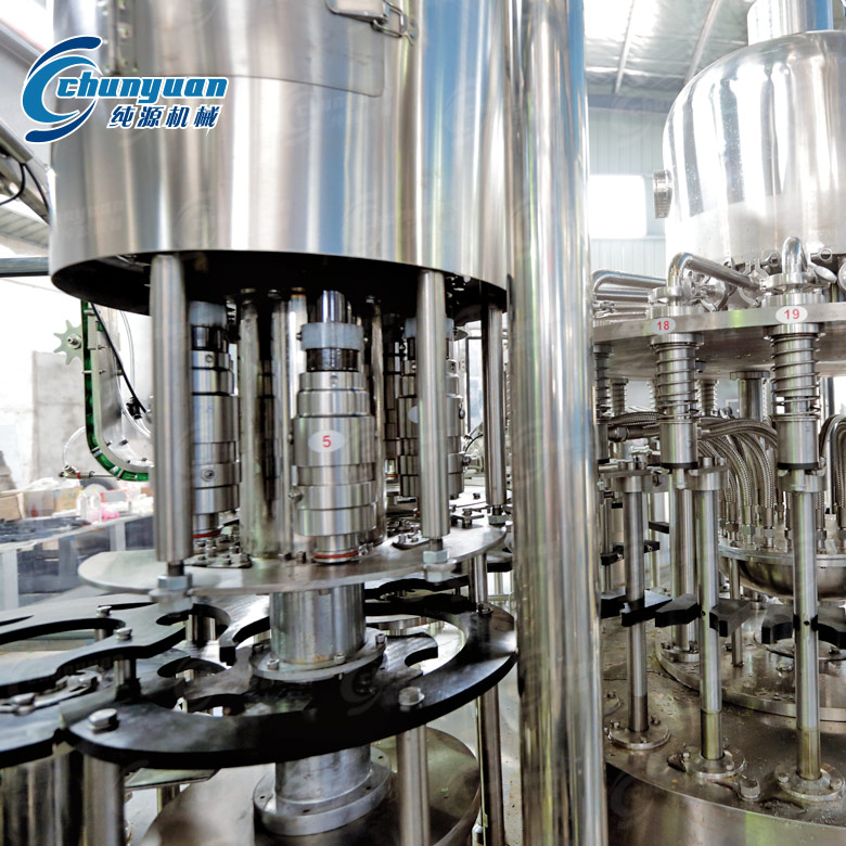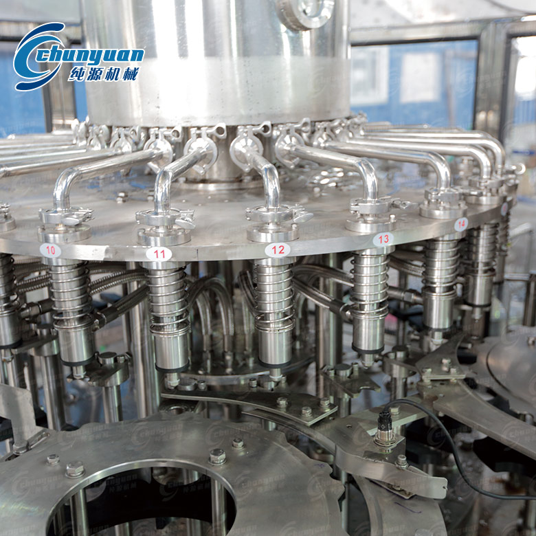 純源機械廠家生產制造的紅茶飲料設備采用卡瓶頸傳動技術,實現全自動沖瓶、灌裝、封蓋等工序,自動化程度高;
