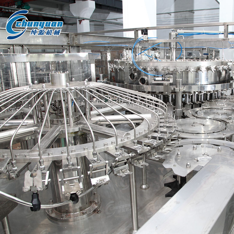 純源機械廠家供應的雪碧含汽飲料機械集沖洗、灌裝、旋蓋于一體,適用于灌裝雪碧、可樂、碳酸飲料、含汽蘇打水等含汽飲料的聚酯瓶灌裝,全過程實現自動化。