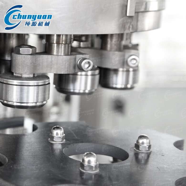 易拉罐椰子汁飲料機械采用常壓灌裝原理,當空罐經撥輪進入升降托罐盤后,灌裝閥和空罐對中,空罐升起并密封,同時自動打開灌裝閥的閥口,當灌裝液面堵住閥的回氣管口時停止灌裝。灌好的罐子經鉤子鏈送到封口機頭,蓋子經送蓋器及壓頭把蓋子送到罐口上,當托罐機構升起時,壓頭壓緊罐口,封口輪先預封再實封,罐子封好后被打蓋機構的打頭推出,然后進入出罐輸送。